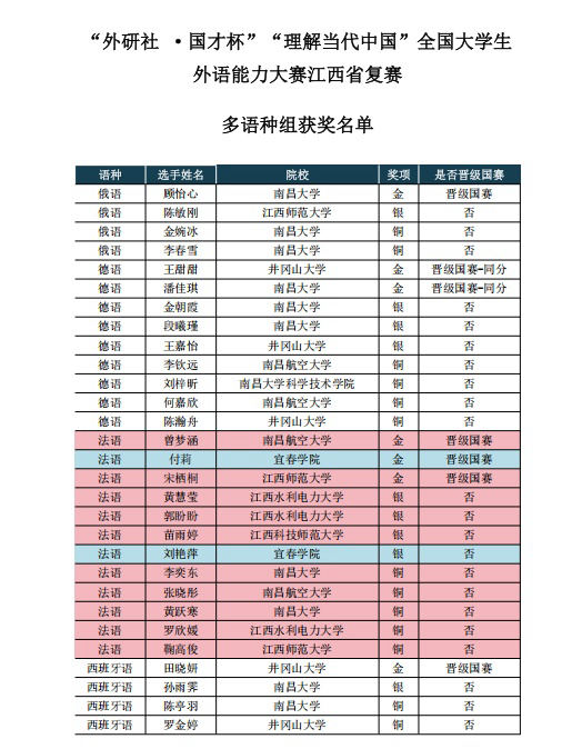 本站讯(外国语学院 曾利霞 谢丽梅)近日,2025“外研社·国才杯”“理解当代中国”全国大学生外语能力大赛江西省复赛(多语种组)圆满落幕。在全省众多参赛选手的激烈角逐中(本次江西赛区共设3金、4银、5铜),我院学子表现亮眼、脱颖而出:23级法语班刘艳萍同学凭借扎实功底斩获银奖,22级法语班付莉同学以全省第二名的优异成绩勇夺金奖,将代表beat365晋级全国总决赛。