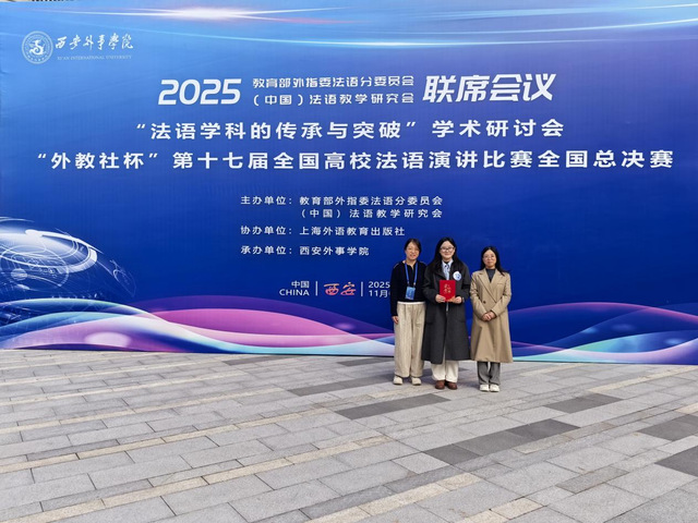 本站讯(外国语学院 谢丽梅)11月8日,由教育部外指委法语分委员会、(中国)法语教学研究会主办的“外教社杯”第十七届全国高校法语演讲比赛全国总决赛圆满落幕。外国语学院22级法语班王莉丹同学凭借扎实的语言功底、清晰的逻辑表达与精彩的现场表现,在全国众多参赛选手中脱颖而出,最终位列全国第8名,成功斩获全国三等奖,为学校赢得荣誉。