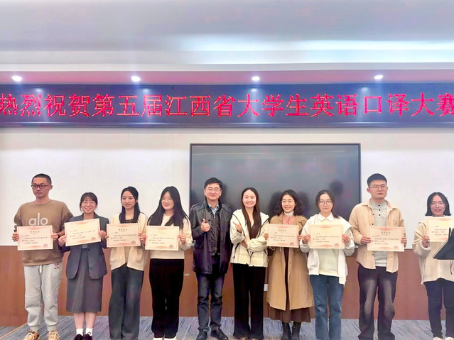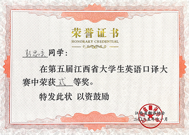 本站讯(外国语学院 曾楚弦)2025年11月8日,第五届江西省大学生英语口译大赛在南昌大学前湖校区成功举办。我院2023 级翻译2班学生彭思奕凭借扎实的语言功底与出色的临场表现,在全省十五所高校50名本科生、研究生选手的同台竞技中脱颖而出,成功晋级决赛,最终斩获全省二等奖。