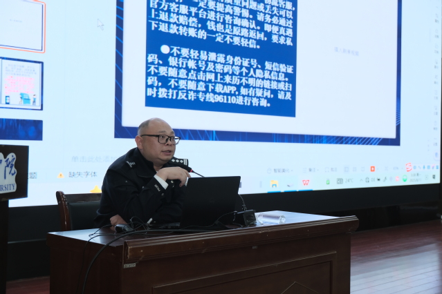 讲座现场,贺警官围绕当前电信网络诈骗犯罪面临的严峻形势和特点,结合高校学生群体社会经验相对不足、易成为诈骗分子目标的实际,对电信网络诈骗案例进行了深入浅出的剖析和讲解,内容涵盖刷单返利、虚假网络贷款、冒充客服、冒充公检法等在校内高发的诈骗类型。