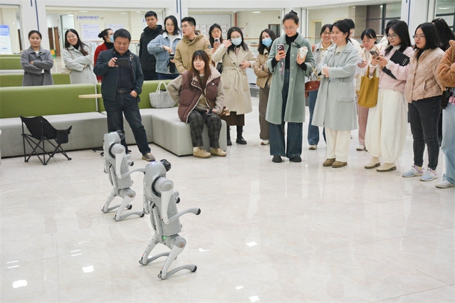 在“科技体验”环节,人工智能与信息工程学院展示了时新的智能产品:机器狗灵活表演了跨越障碍、舞蹈等动作;智能交通实时监测系统演示了实时数据分析与预警功能;由3D材料组装的无人机进行了飞行展示。辅导员们踊跃参与互动,亲身体验科技产品的创新性与实用性。