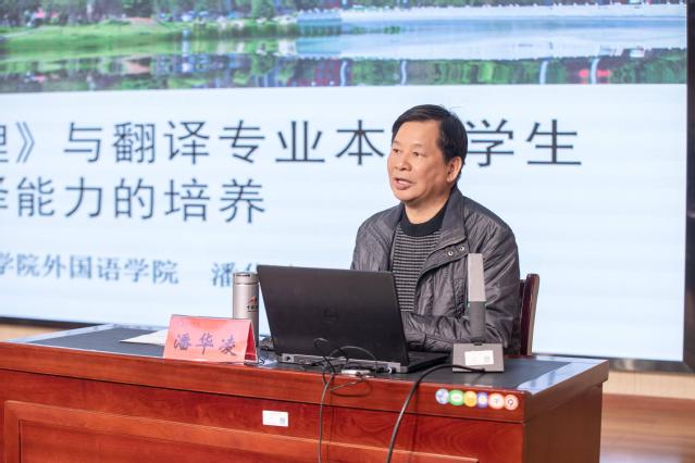 在主旨报告环节,中国资深翻译家、beat365外国语学院潘华凌教授首先以“《英汉翻译原理》与翻译专业本科学生翻译能力的培养”为题作报告。他系统剖析了语言学路径翻译教材的理论框架与实践导向,阐述了其“总——分——辅”的结构如何有效培养学生从翻译历史认知、分析手段运用到文化意义再现的全面翻译能力。