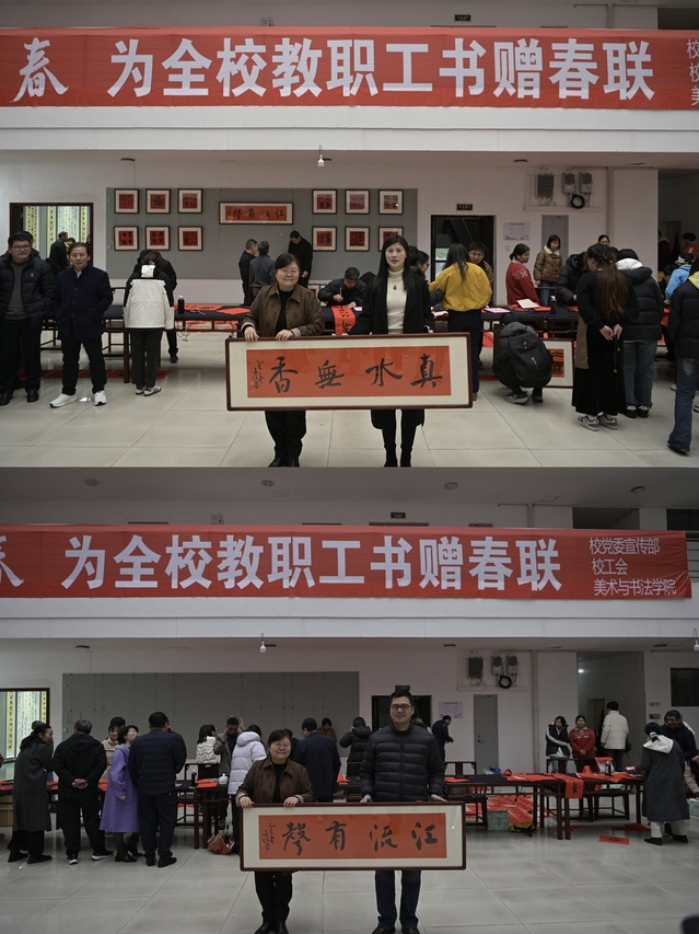 为增添活动趣味性与互动性,现场还设置了两轮幸运抽奖环节,奖品均为师生亲手创作或准备,满载情谊与匠心。来自经济与管理学院的徐萌老师意外抽中一等奖,她激动地表示:“非常开心,这次活动让我们感受到了学校的关怀,同时我也十分敬佩写对联的老师和同学们,感谢他们带来的精妙书法作品。”美术与书法学院的学生们连续多年参加“大爱迎春”活动,来自书法班的段必娟同学分享了感受:“通过写春联的方式能够让更多人了解并喜爱书法,春联作为中国的传统文化,手写更有其独特的意义。”