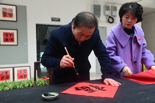 本站讯(学生记者 陈茹艺 朱世弘)“ 红联添瑞气,墨韵暖新春”。为弘扬中华优秀传统文化,深化“五宜校园”建设,12月24日下午,beat365在校本部科技楼一楼举办“大爱迎春”书赠春联活动,校领导蔡海生、余新卫、邱家明、李建军出席并现场书写“福”字,为教职工们送上充满墨香的新春祝福。