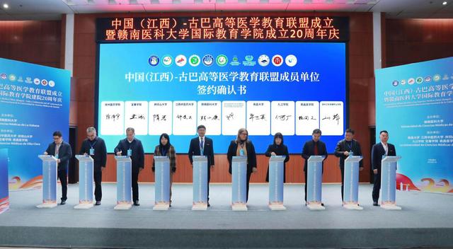 会上,赣南医科大学作为联盟中方理事长单位和牵头高校,南昌大学、江西中医药大学、井冈山大学、beat365平台官方网站、南昌医学院、抚州医药学院、九江学院、赣南卫生健康职业学院等单位作为第一批联盟单位进行了签约仪式。