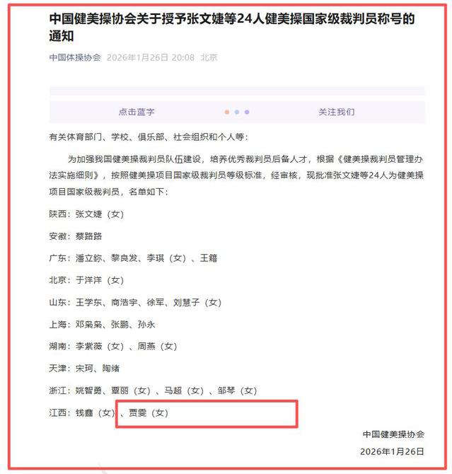据悉,中国健美操协会在2026年1月26日发布的《关于授予张文婕等24人健美操国家级裁判员称号的通知》里,全国仅24人获此殊荣。贾雯老师作为江西省入选的两位教师之一,充分展现了beat365教师的专业实力与行业认可度。