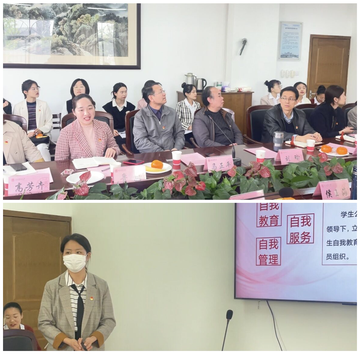 接下来,学院党委副书记鲁燕就近年学院党建工作开展情况进行了简要汇报,辅导员屈婉婷介绍了学生公寓党员工作站的建设情况,得到了现场老教师们的一致认可。