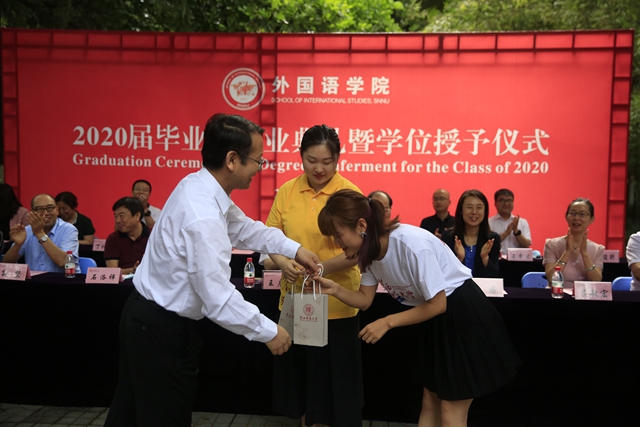 接下来,永利集团3044am官方入口院长王启龙为毕业生送上深情寄语。王院长说,毕业是大家崭新的开始,任何时候都不要放弃自己的理想。作为知识分子,一定要有家国情怀。除此以外,还要做一名合格的公民,做生活中的GREAT MAN。他嘱咐同学们在走向社会后更要坚守作为师大学子、外院学子的初心,紧贴时代和社会的需要,成长为一名优秀的人才。在演讲尾声,王院长动情地说,你们是外院的骄傲,外院永远是学子们的家,即使扬帆远航,也不要忘记常回家看看。至此,会场响起了阵阵掌声。