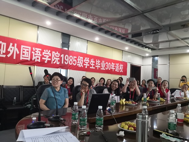 座谈会伊始,全体校友观看了毕业三十周年纪念视频。一张张老照片,一首首老歌曲,仿佛把大家又带回了三十年前的大学时代,许多校友流下了激动的热泪。随后,在场老师们一一发言,深情回忆了校友们当时的在校情况和记忆中的趣闻趣事,讲述了外语学院三十年来的发展,肯定了每一位校友的奋斗和成绩,表达了对校友们的祝福之情。马正平书记在发言中代表王启龙院长和其它学院班子成员对1985级校友们返校表示热烈的欢迎、衷心的感谢和祝福,并就学院近年来的发展情况、学科建设情况做了介绍,鲁燕副书记介绍了学院学生工作的情况,并邀请校友们常回学院给学弟学妹们讲讲外语人的成长故事。