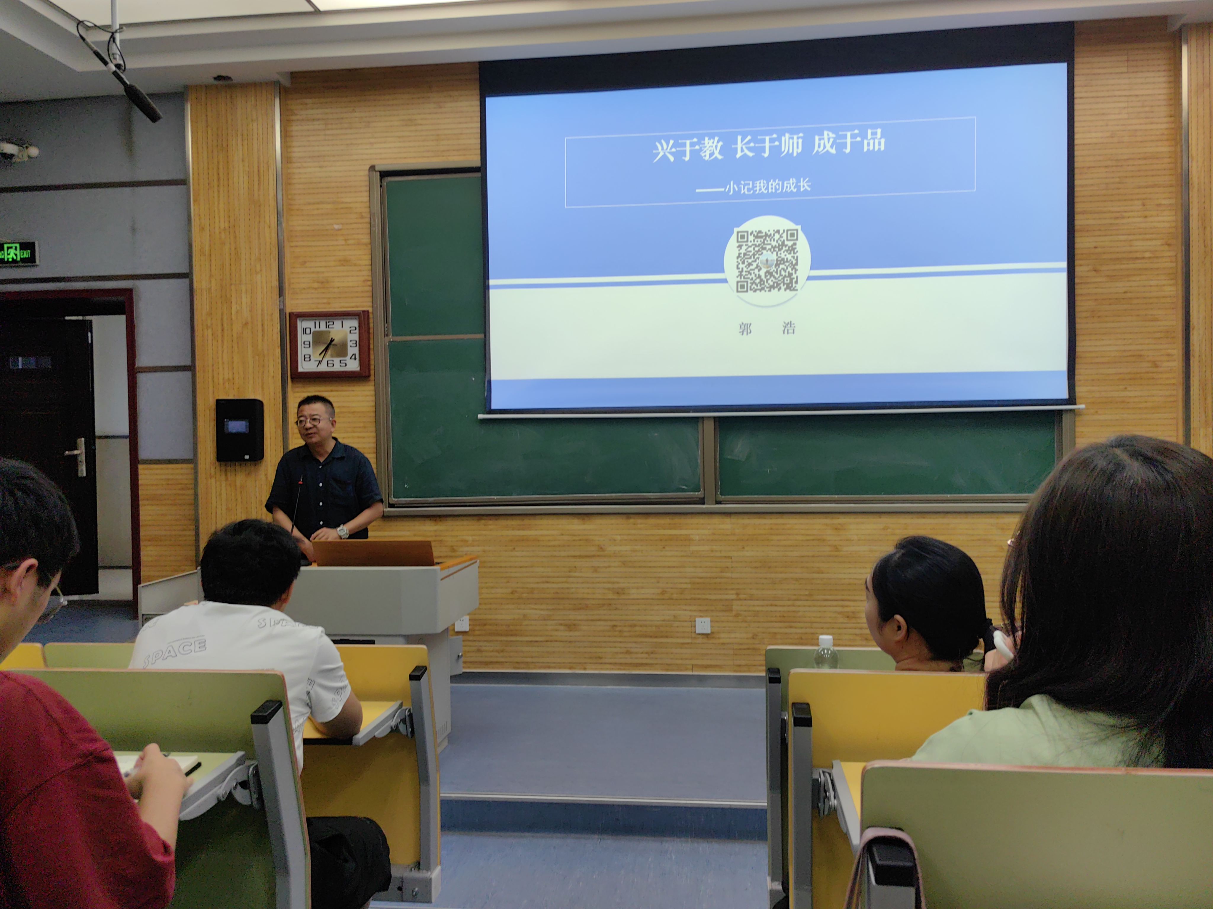在讲座中,郭浩老师分享了他从一名年轻教师成长为经验丰富的教学名师的心路历程。他强调,教育最重要的不是来自于言传,而来自于身教,时时刻刻保持良好的行为规范,也能够激励自己在工作中充满热情。此外,郭老师细致生动的总结分析了自己在成长和实践过程中遇到的真实问题:如何分析不同年龄阶段学生的心态,如何与学生更好地相处,如何在工作失意时坦然面对,如何平衡家庭与工作。通过大量的教育经验分享和教学实例分析,郭浩老师以幽默诙谐的口吻、深入浅出的方式为师范生同学们打开了正确认识教师职业的大门。最后,郭老师告诉大家,在面对选择、面临困难的时候,应当坚持遵循做一名优秀教师的初心,与学生共同成长,用爱浇灌出和谐共进的良好师生关系。