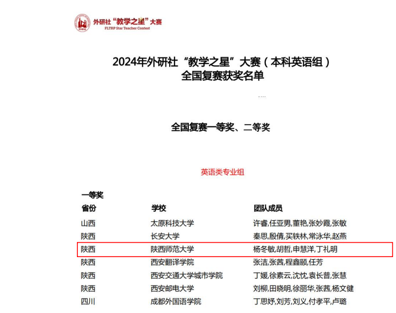 2024年6月20日,2024年外研社“教学之星”大赛(本科英语组)获奖名单揭晓,由永利官网英语系胡哲老师主讲,杨冬敏、申慧洋、丁礼明老师组成的参赛团队喜获本科英语组(英语类专业组)全国复赛一等奖。