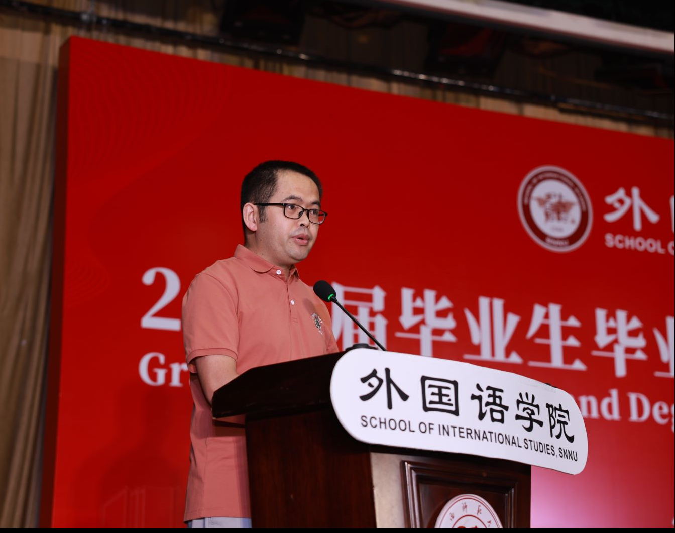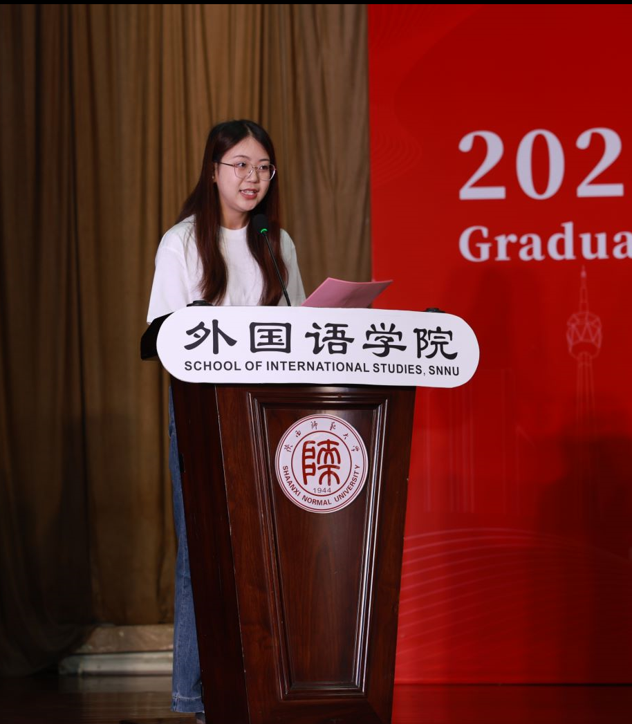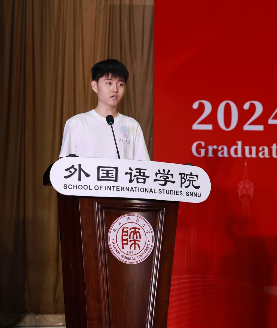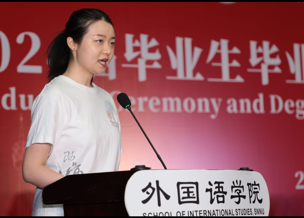 随后,本科英语师范毕业生代表王路峣、本科非师范毕业生代表日语专业黄楠楠、研究生毕业生代表学科英语专业王瑟艺分别发言。代表全体同学向学院领导、老师和亲友致以衷心的感谢,并表示将传承师大人的精神,肩负外语人的使命,用外语讲好中国故事,谱写新时代教育报国之歌。