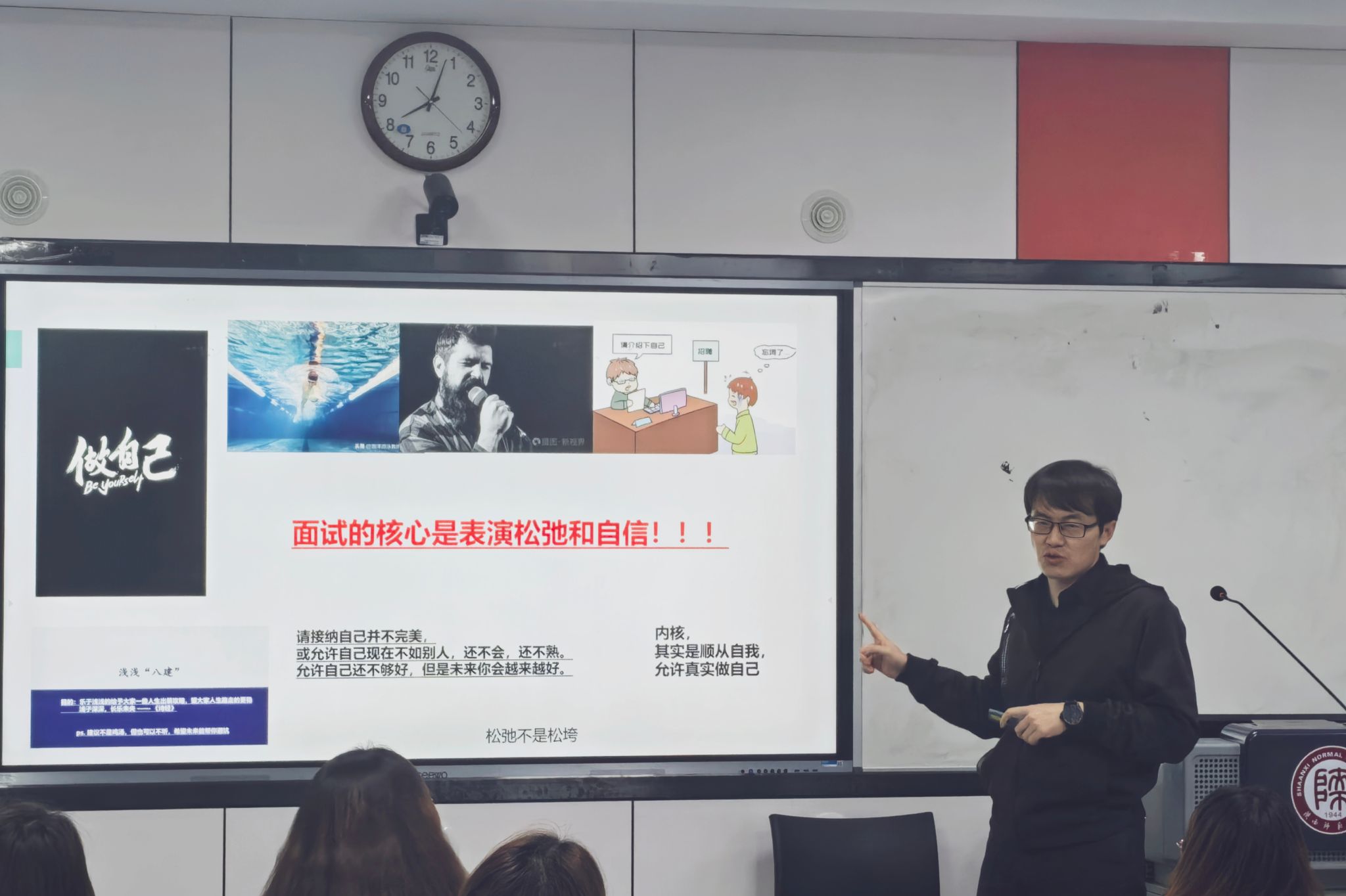 随后,魏东昀老师着重讲解了面试中的“心法”,即如何调整自己的心态,保持积极、乐观的态度。核心是表演松弛和自信!他分享了自己在职场中的心路历程,鼓励毕业生要勇敢面对挑战,保持积极的心态,不断提升自己的能力和素质。