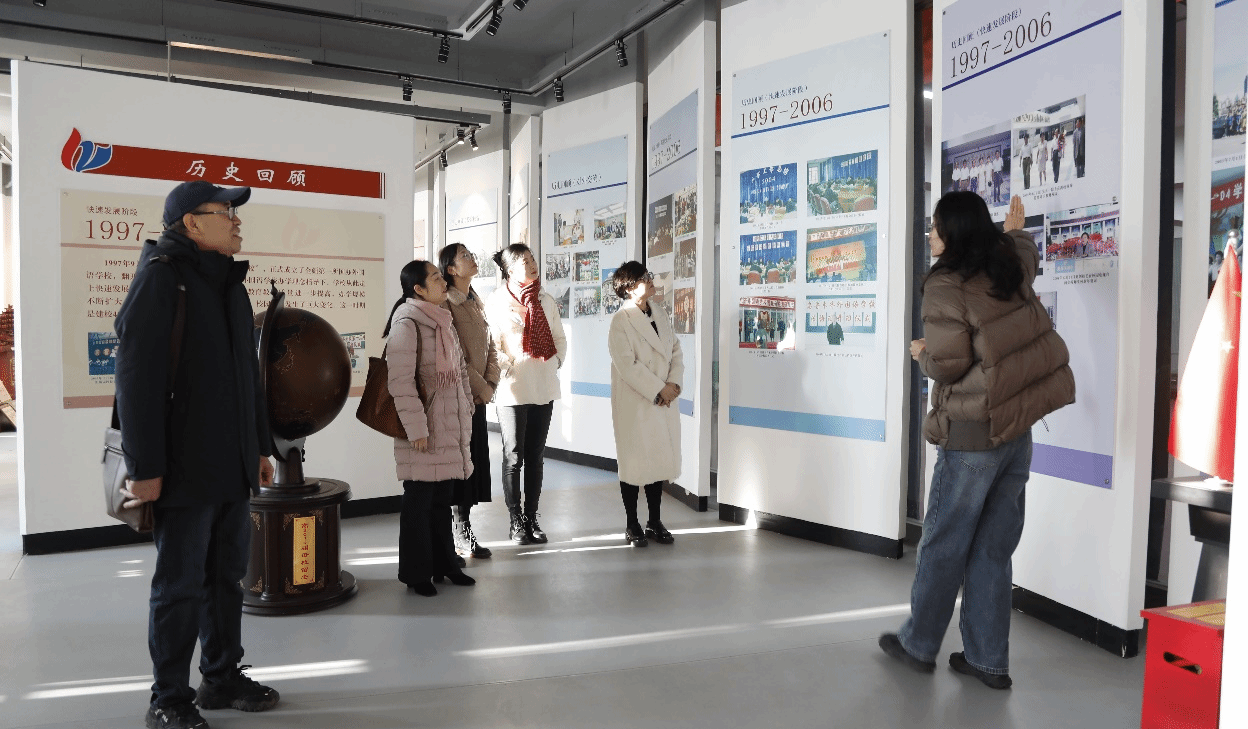 随后,在胡曼校长带领下,孙坚一行参观了学校的校史馆博艺楼,学校语文教师陈佳宁作为校史馆的讲解员,以学校的办学历程为脉络,生动详实地介绍了学校的光辉历程和教育成果,全方面、多角度地展现了学校的历史积淀、卓越的发展成就和开放包容的校园文化。