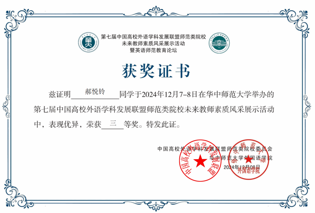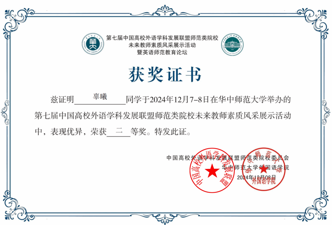 2024年12月7-8日,“第七届中国高校外语学科发展联盟师范类院校未来教师素质风采展示活动”在武汉举行。该活动由中国高校外语学科发展联盟师范类院校委员会主办、华中师范大学承办,来自全国41所院校的80名优秀师范生参加了此次活动。永利集团3044am官方入口英语系2022级师范生辜曦、郝悦铃两位同学表现优异,分别获得二等奖和三等奖。指导老师杨冬敏、丁礼明荣获优秀指导教师称号。
