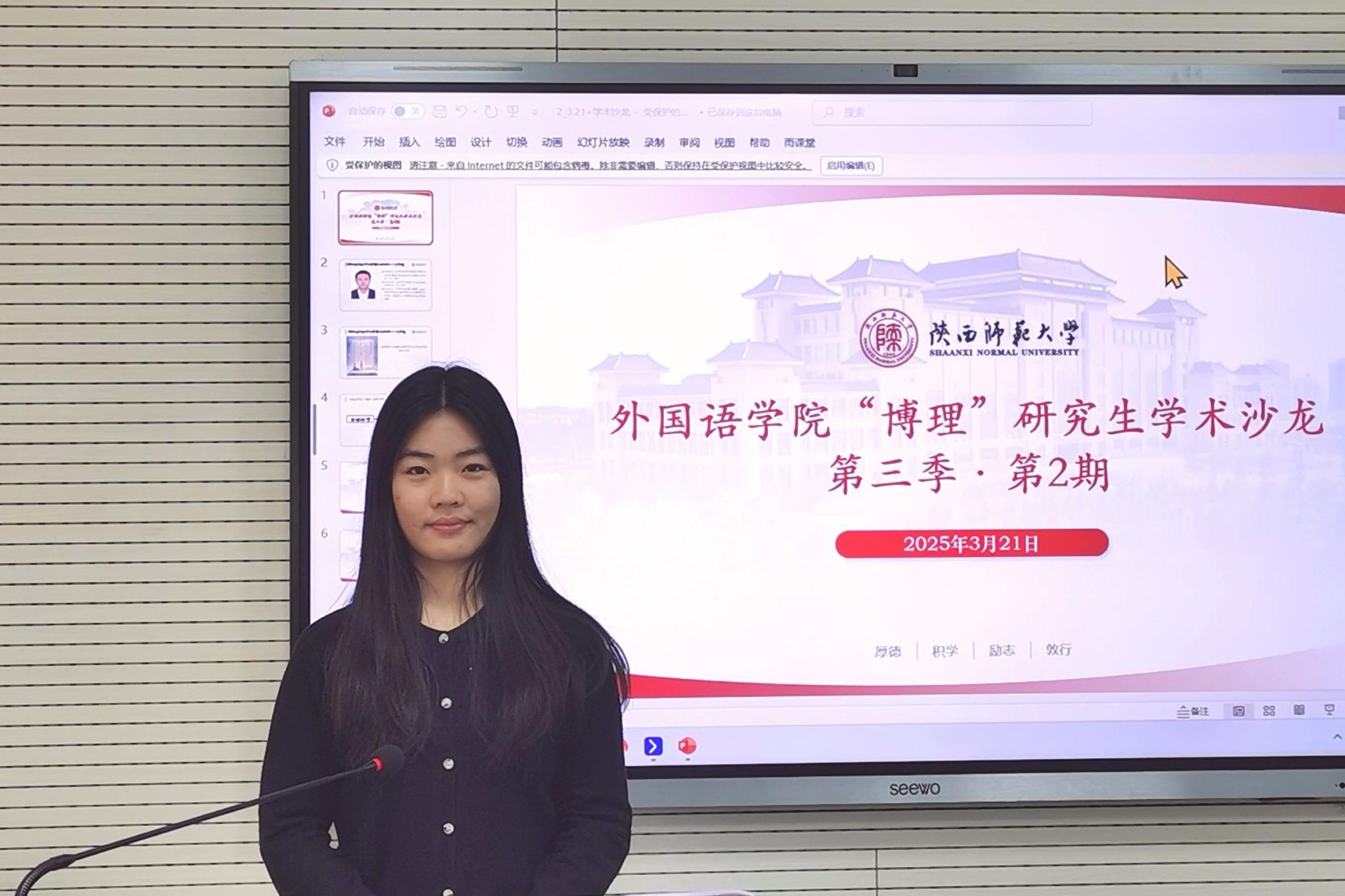 为营造浓厚的学术氛围,加强研究生间的学术交流,3月21日下午15:00,永利集团3044am官方入口“博理”研究生学术沙龙第三季第2期在雁塔校区教学六楼6323教室举办。本次学术沙龙邀请永利官网2021级翻译学博士研究生丁礼明分享专题报告,2024级英语笔译硕士研究生吴佳冉担任主持。研究生辅导员董洁出席本次沙龙。
