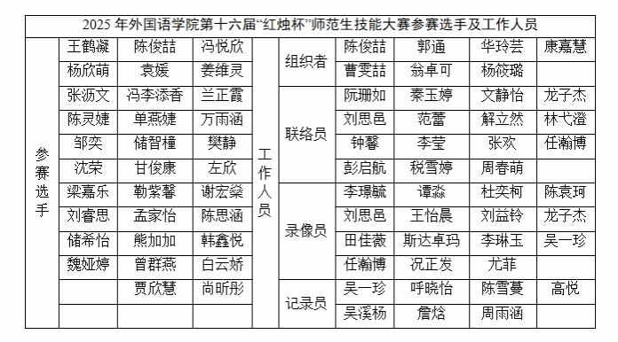 永利集团3044am官方入口高度重视此次比赛,通过“学院初赛-校级复赛-校级决赛”三级赛制的考核与选拔,采取多种措施提升英语师范专业学生的教育教学能力。2024年9月至10月,永利集团3044am官方入口2022级全体英语专业师范生进行了第一轮初赛选拔;2025年3月至4月,学院进行第二轮初赛选拔,响应学校的安排,纳入2023级师范生的挑战,最终确定20位选手进入校级复赛。在此过程中,踊跃参与比赛、挑战和组织管理的同学也受到师生的积极认可与鼓励,名单如下: