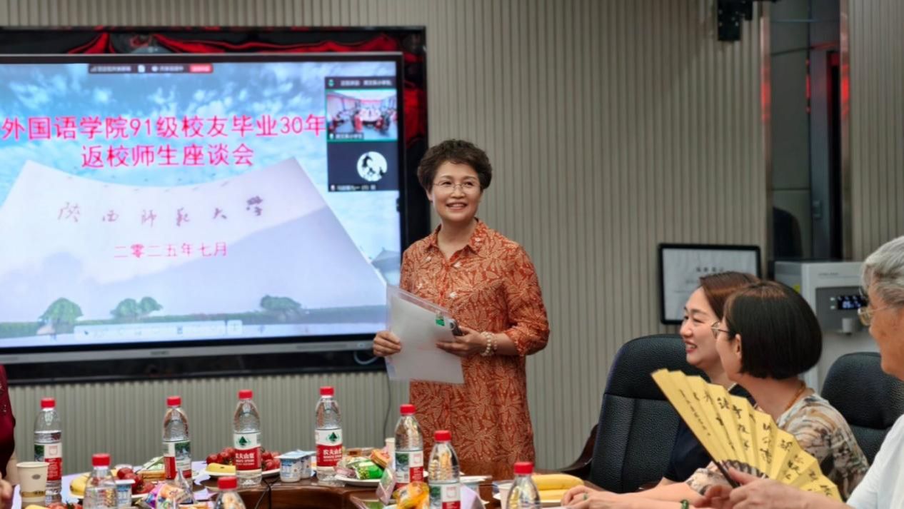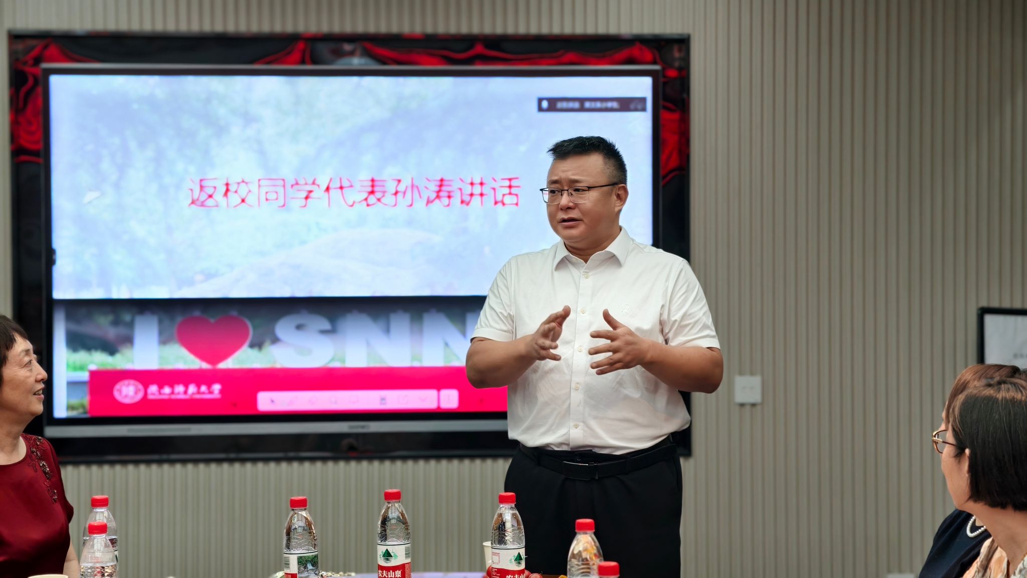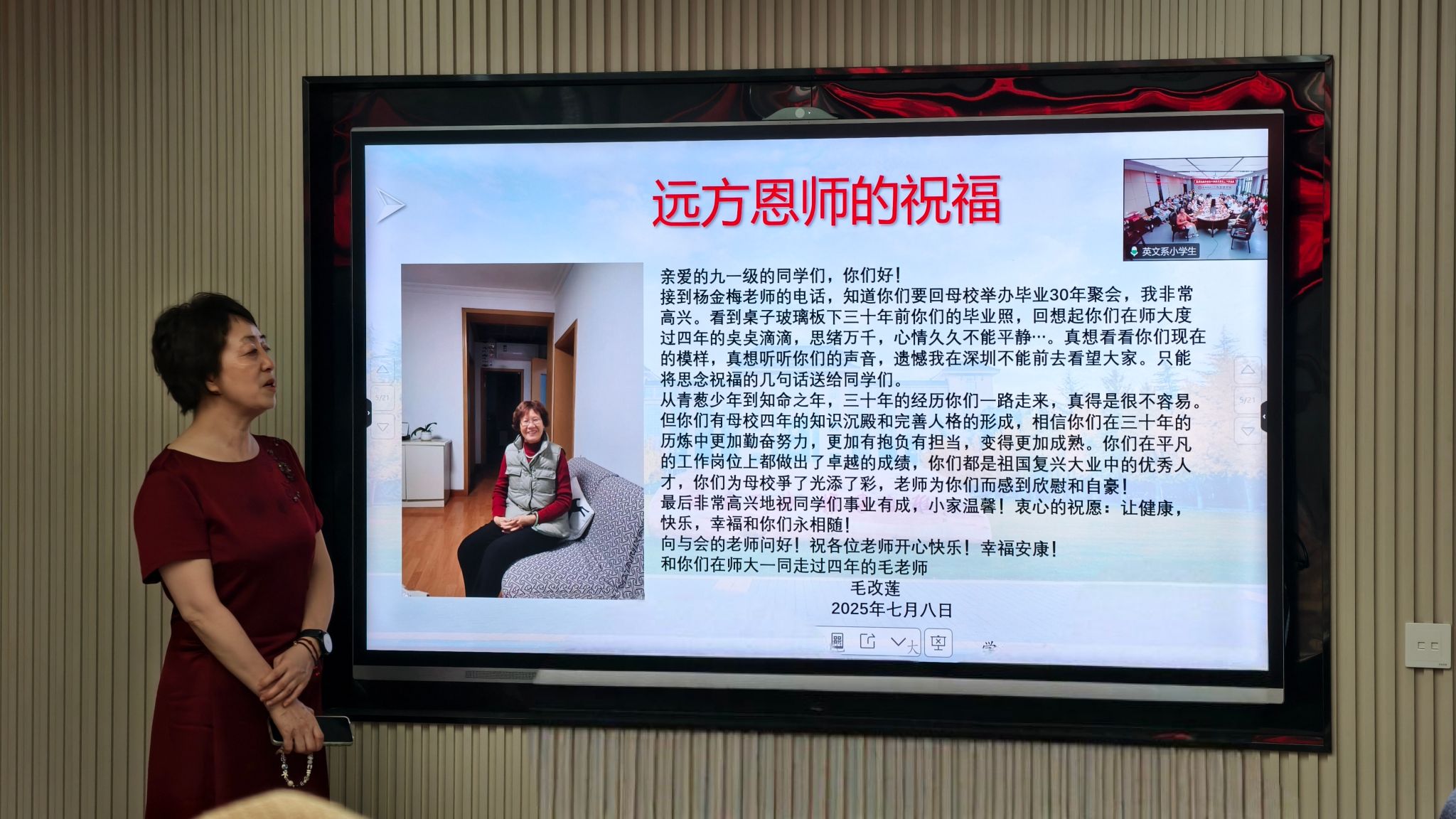 时任教师代表吕敏宏、李炜、杨达复先后发言。他们追忆三十年前课堂内外的点滴往事,细数同学们当年的认真与朝气,更为大家毕业后在各自岗位上践行“西部红烛 两代师表”精神而自豪,并祝愿校友们工作顺利、身体康健。杨达复老师还现场献唱一曲,表达了师生情深。