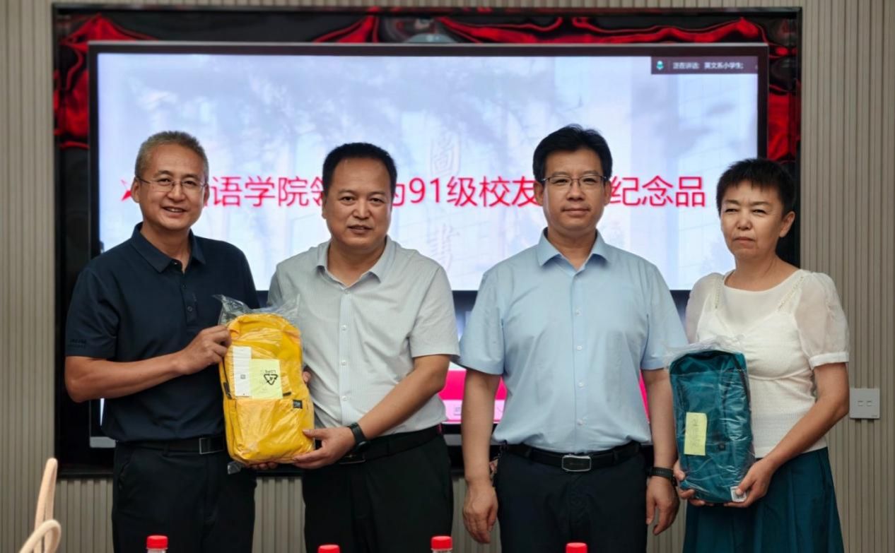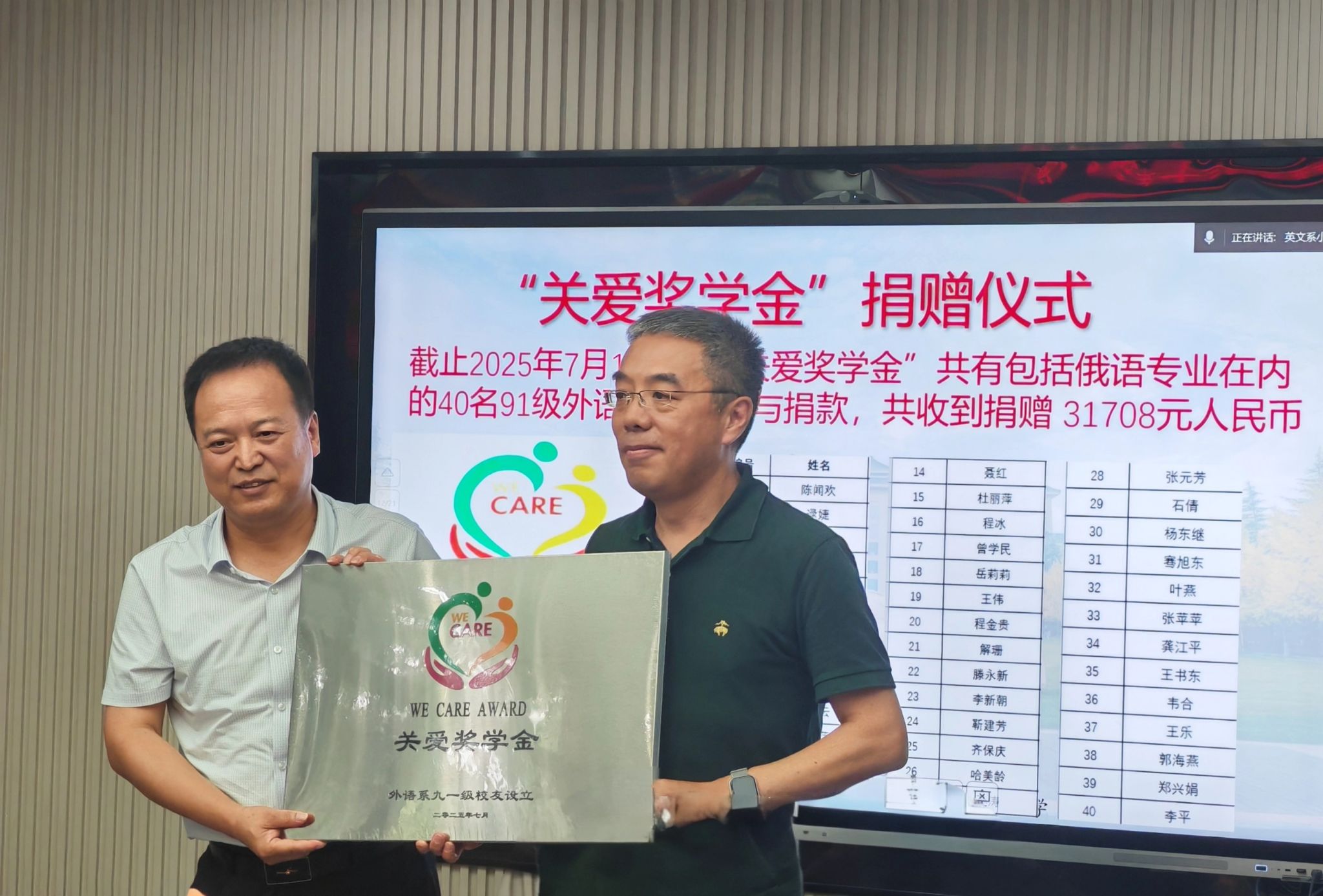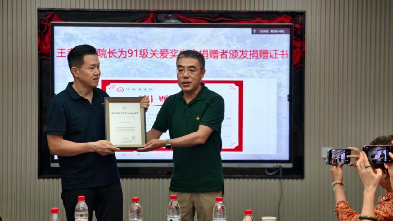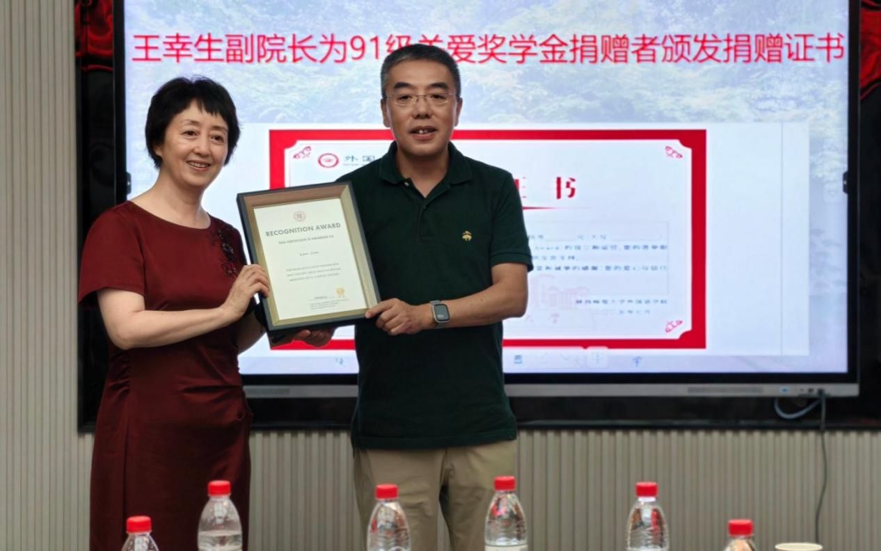 校友代表孙涛回忆道:“外语系教会我们的不仅是语言,更是把世界‘翻译’成可能的能力。今天回到这里,就像回到精神的港湾。”校友陈闻欢深情讲述设立“关爱奖学金(We Care Award)”的缘起:“是老师们当年深夜为我们批改作业的身影,让我懂得教育即关怀。”陈闻欢代表全体91级校友将3万余元关爱奖学金赠与学院。董增云书记接牌,并为参与捐赠的校友颁发证书。