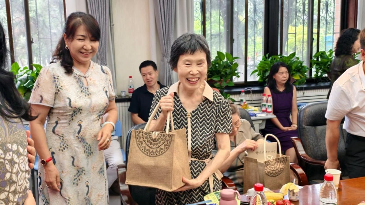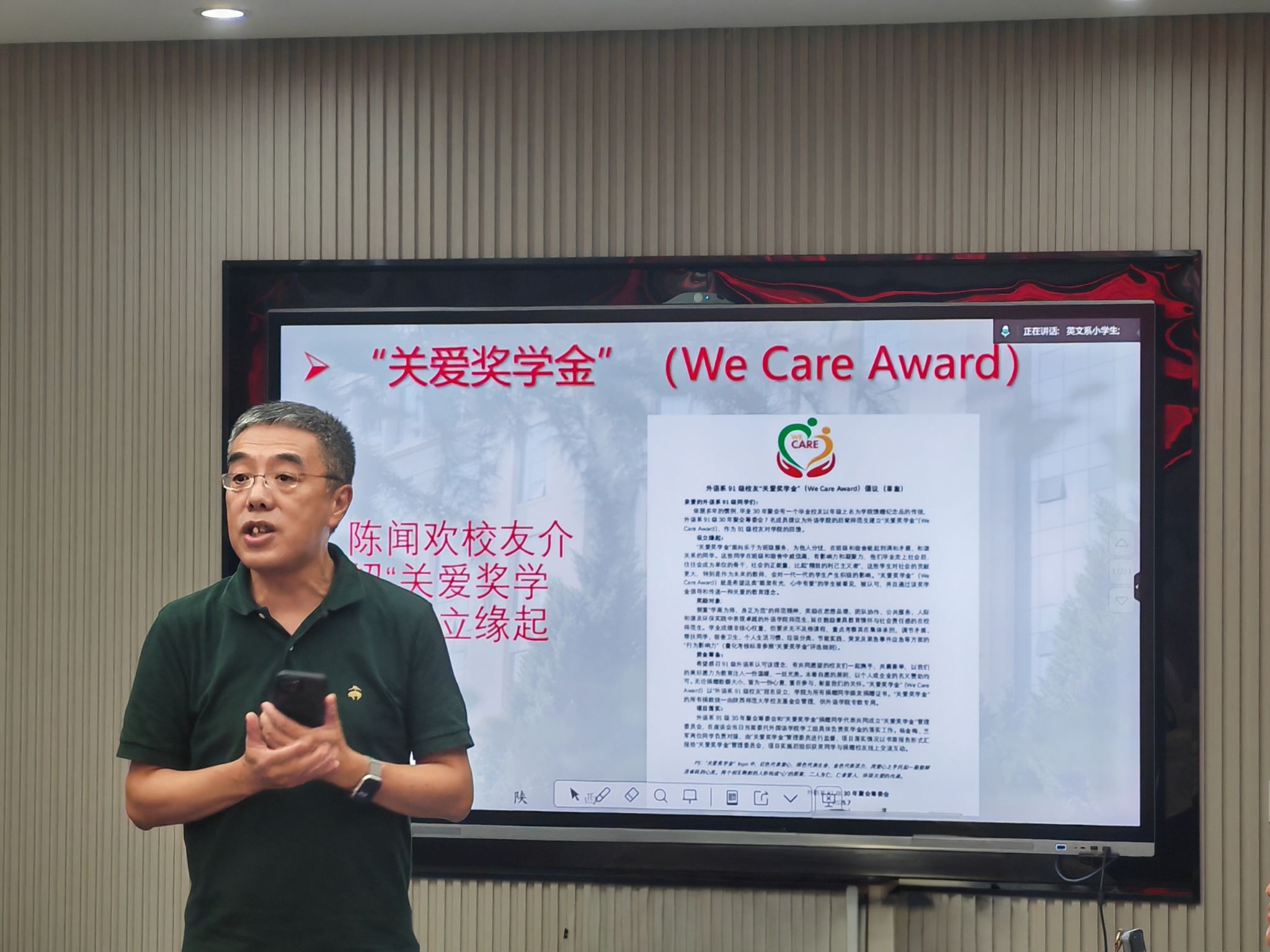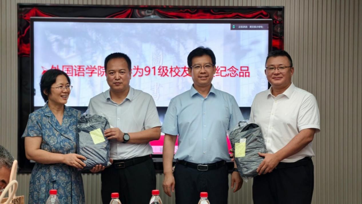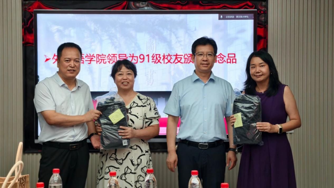 校友代表孙涛回忆道:“外语系教会我们的不仅是语言,更是把世界‘翻译’成可能的能力。今天回到这里,就像回到精神的港湾。”校友陈闻欢深情讲述设立“关爱奖学金(We Care Award)”的缘起:“是老师们当年深夜为我们批改作业的身影,让我懂得教育即关怀。”陈闻欢代表全体91级校友将3万余元关爱奖学金赠与学院。董增云书记接牌,并为参与捐赠的校友颁发证书。
