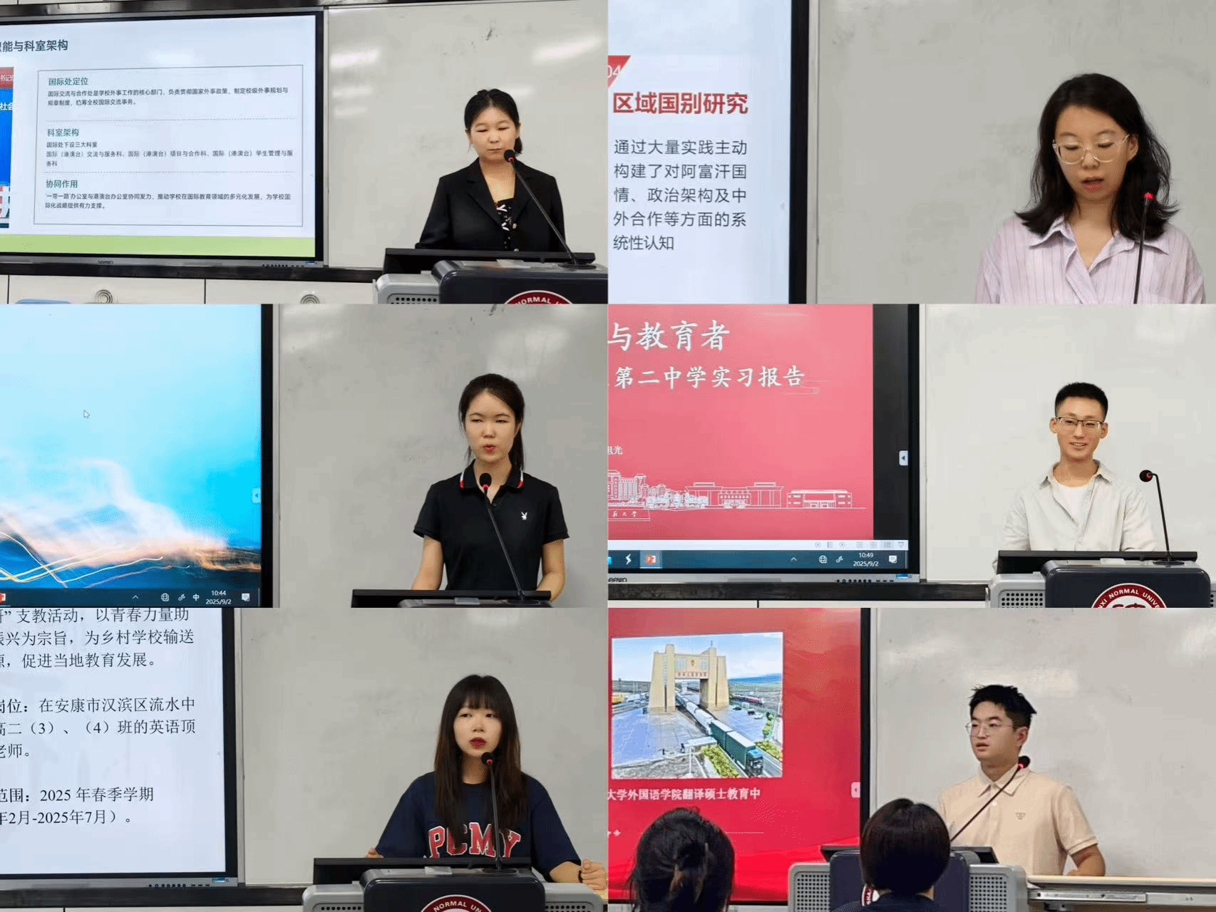 2023级翻译硕士研究生的6个实习小组依次派出代表,汇报各组的实习经历与感悟。实习单位类型丰富,包括永利集团3044am官方入口国际交流与合作处、永利集团3044am官方入口阿富汗研究中心、译国译民有限公司、西安市雁塔区第二中学、新疆边防检查总站等。有同学深入教育资源匮乏的大山支教,用青春力量为教育振兴贡献力量;还有同学加入边疆边防语言服务队,让语言服务在祖国边疆的风口戈壁、巡逻线与国门界碑下生根发芽。实习单位的多元化,充分体现了永利集团3044am官方入口培养翻译人才的多样化理念。