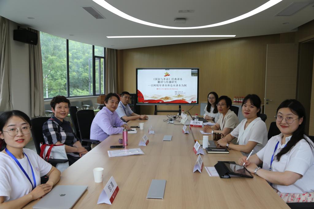 主旨发言后,与会者分成两个小组,围绕“共产主义与翻译”、“马列主义文献研究”、“习近平新时代中国特色社会主义思想的外译”等议题展开讨论。在导师陶源老师的指导下,周阔在发言中梳理了《国家与革命》的61个汉译本,并以柯柏年和仓木译本为例,结合列宁《国家与革命》俄语原文对柯柏年译本的误译现象进行了研究。根据两译本传播主体、传播时代背景及传播对象的不同,分析两译本在翻译质量差异的情况下,均产生了较强传播效果的原因。在各分会场,与会者纷纷发表自己的学术研究成果与见解,并与主持人及现场听众进行深度讨论与交流,现场气氛热烈。
