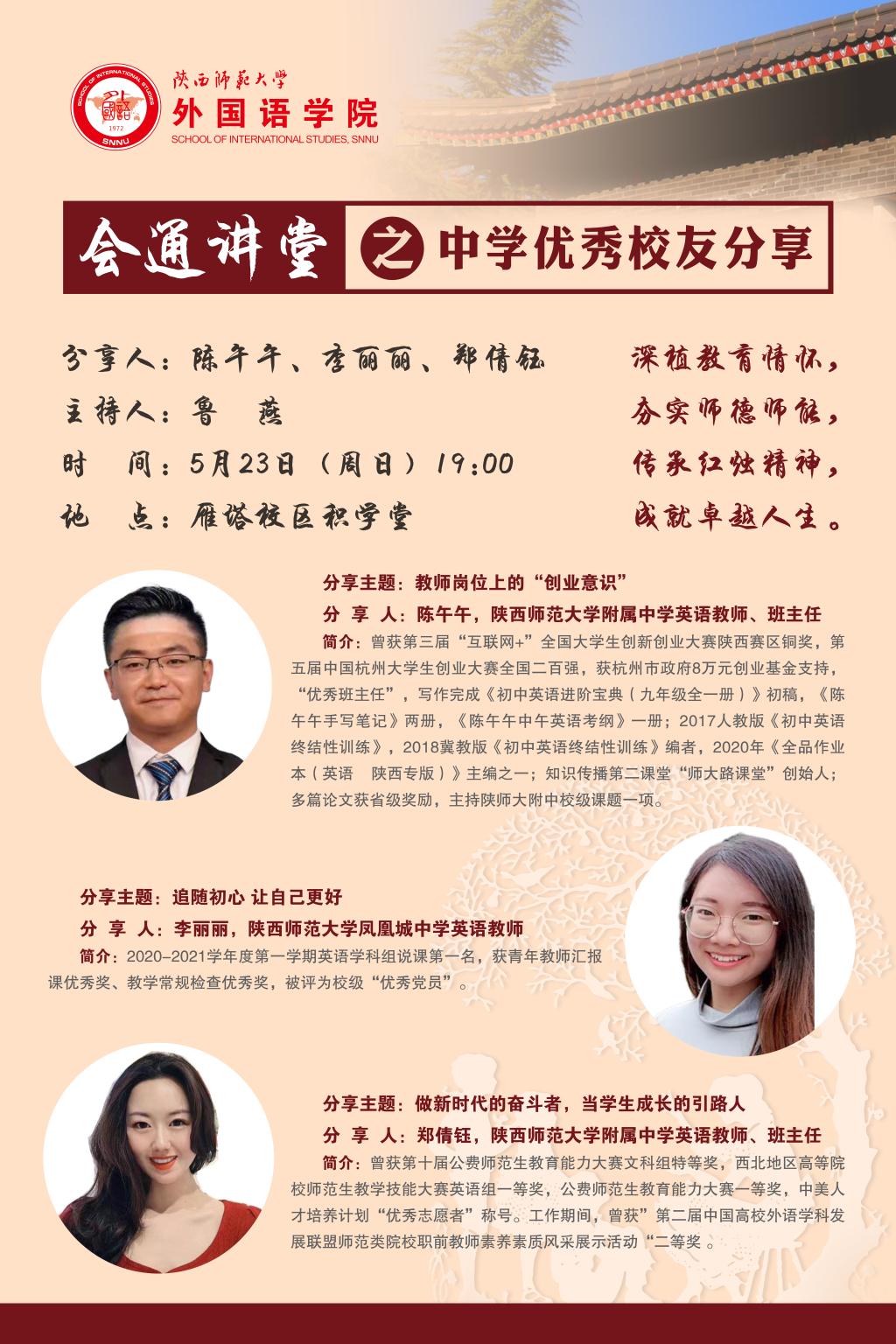 为提高师范生师德师范,更好的践行“西部红烛”精神,共树“两代师表”,永利集团3044am官方入口于2021年5月23日晚七点在雁塔校区积学堂举行会通讲堂之中学优秀校友分享会。永利集团3044am官方入口党委书记董增云,2017级辅导员李丹,2018级辅导员曹钰林,2020级辅导员田毓霖、武瑞英以及全体师范生参加了本次讲堂。本次讲堂分别邀请到永利集团3044am官方入口附属中学教师陈午午、永利集团3044am官方入口凤凰城中学教师李丽丽、永利集团3044am官方入口附属中学教师郑倩钰为同学们做主题分享。讲堂由永利集团3044am官方入口党委副书记鲁燕主持。