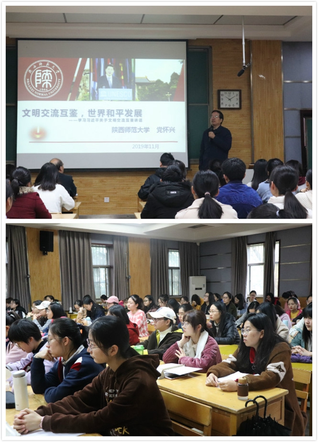 为进一步深入学习贯彻习近平新时代中国特色社会主义思想,结合“不忘初心,牢记使命”主题教育要求,2019年11月1日上午,永利集团3044am官方入口邀请副校长党怀兴在雁塔校区5301教室向永利集团3044am官方入口学生讲授了一堂生动的思政课,主题为“文明交流互鉴,世界和平发展---学习习近平关于文明交流互鉴讲话”。学院党委书记马正平、副院长孙坚、副书记鲁燕、辅导员李丹、屈婉婷及学生150余人聆听了课程。