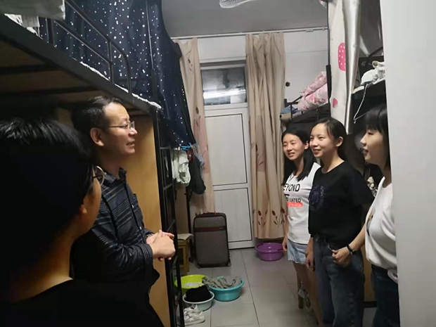 9月9日晚,永利集团3044am官方入口党委书记马正平、副院长刘全国、党委副书记鲁燕以及研究生辅导员董洁走进2019级研究生新生寝室,亲切问询新生入学情况。