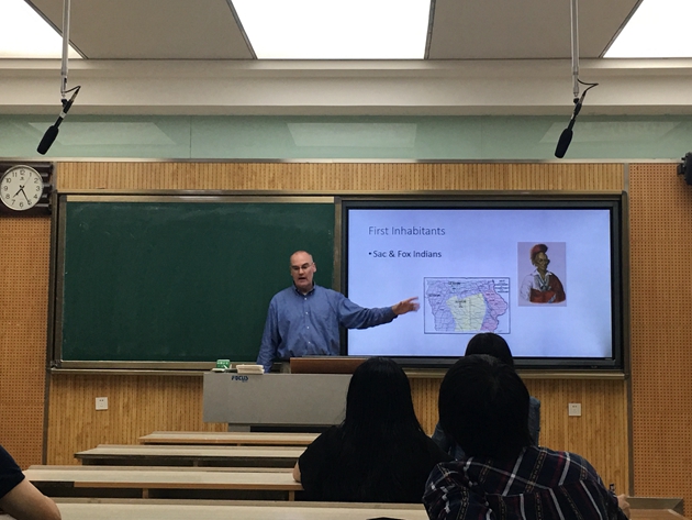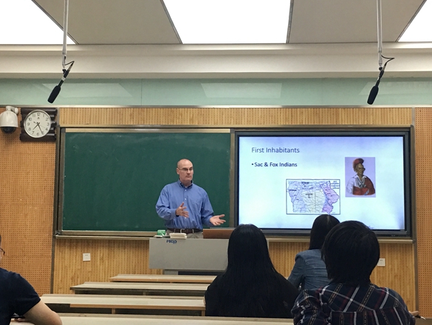 在孙坚副院长向Jeff Bremer教授介绍到场各位老师及学生后,讲座正式开始。Jeff Bremer为爱荷华州立大学历史学教授,2019年东北师范大学富布莱特学者,著有A Store Almost in Sight: The Economic Transformation of Missouri from the Louisiana Purchase to the Civil War(2014)一书,近年来的主要研究领域为1673-2020年间爱荷华州的新历史。他首先概述了本次讲座涉及的主要内容,包括爱荷华州的地理位置,人口数据,经济发展模式以及内战、经济大萧条和二战中的爱荷华州。随后,又从该州的第一批定居者、公民生活挑战、罗斯福新政等方面为听众描述了一个生动具体的爱荷华州。