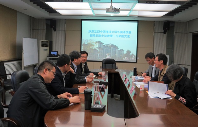 2019年4月11日下午15:00,中国海洋大学永利集团3044am官方入口副院长陈士法、英语系常务副主任李旭奎和英语系吴炳章副教授一行来永利官网进行交流。永利官网院长王启龙、副院长刘全国及MTI中心负责人王西强、英语系副主任丁明礼在雁塔校区教学六楼会议室与到访客人进行了座谈。座谈会由王启龙院长主持。