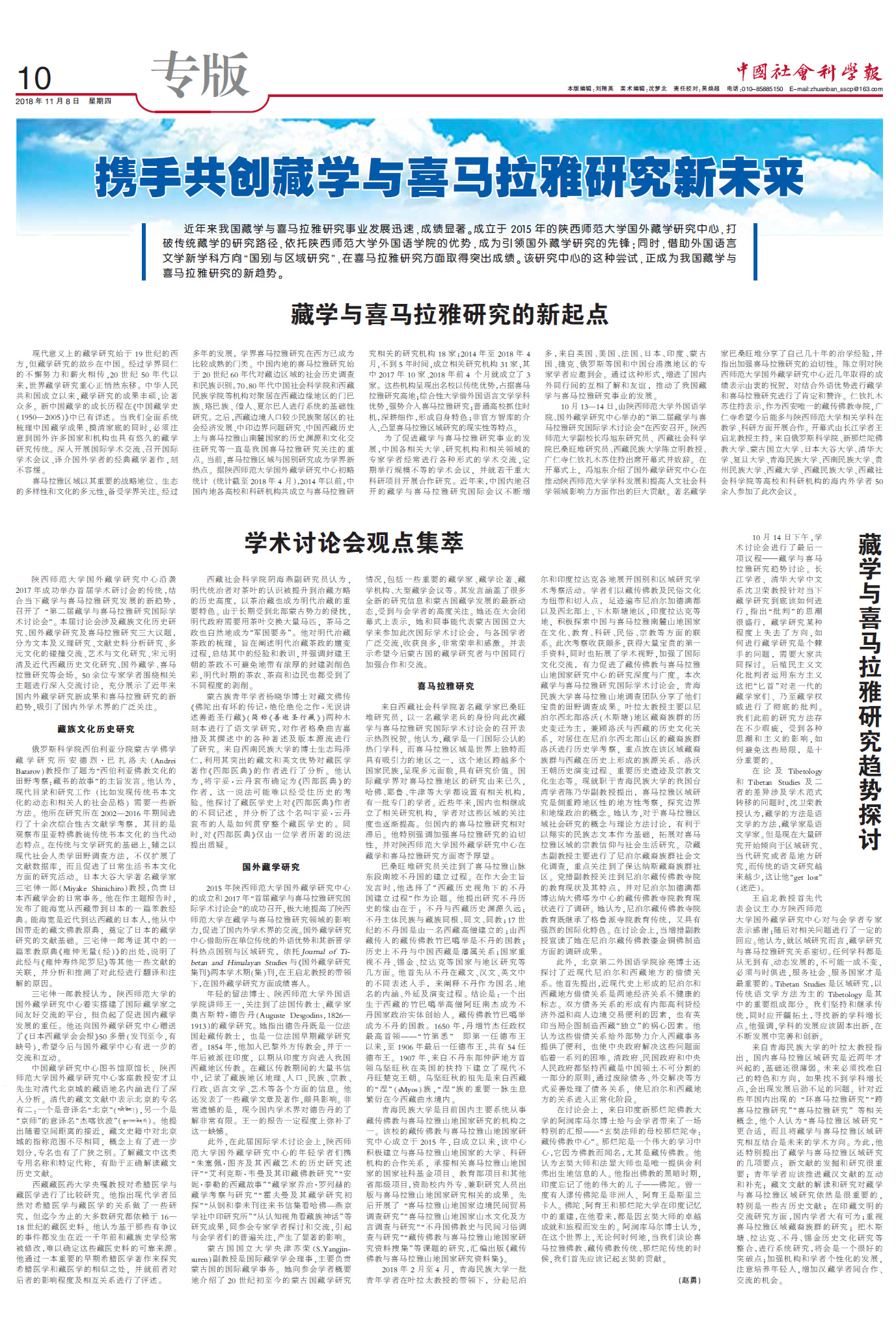 2018年11月8日,《中国社会科学报》在第10版专版以“携手共创藏学与喜马拉雅研究新未来”为题,对永利官网永利集团3044am官方入口、国外藏学研究中心举办的“第二届藏学与喜马拉雅研究国际学术讨论会”进行了报道。文章从藏学与喜马拉雅研究的新起点谈起,凝练本届研讨会与会专家的学术观点,同时对藏学与喜马拉雅研究的趋势进行深入探讨。文中指出,永利集团3044am官方入口国外藏学研究中心,打破传统藏学的研究路径,依托永利集团3044am官方入口的优势,成为引领国外藏学研究的先锋;同时,借助外国语言文学新学科方向“国别与区域研究”,在喜马拉雅研究方面取得了突出成绩。