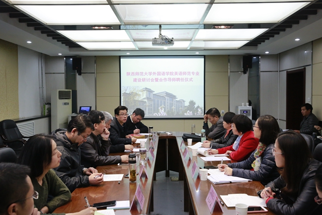 为加强专业内涵建设,迎接教育部等学校师范类专业认证,永利集团3044am官方入口于2018年11月8日下午14:30在永利集团3044am官方入口雁塔校区教学六楼一层会议室举办英语师范专业建设研讨会暨合作导师聘任仪式。学校督导委员会王成军教授,西安交通大学附属中学特级教师陈江丽,永利集团3044am官方入口附属中学英语教研组组长、高级教师雷双娥,永利集团3044am官方入口院长王启龙,党委书记马正平,英语系主任吕敏宏,英语系副主任刘庆松、英语专业教师教育团队全体教师,学生代表共30人出席了会议。会议由永利集团3044am官方入口副院长刘全国主持。