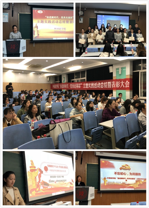 “通过党的十九大精神宣讲和基层优秀党员寻访,我更加深入地了解了社会现状和百姓故事,认识到了党的十九大报告所传达的精神,更读懂了政策背后的意义和党员的使命。”研究生第四党支部王斯曼同学在“奋进新时代·党员走基层”主题实践活动总结大会上这样谈到。2018年6月至8月,学院党委积极倡导全体学生党员利用暑假开展“奋进新时代·党员走基层”主题实践活动。三个月中,共有107名学生党员分赴陕西渭南、山东莱阳、山西运城、贵州黔南布依族苗族自治州、福建厦门等地开展实践活动。青年党员们走进社区村镇、走进企业单位、走进大中院校,积极宣讲党的十九大精神,同时寻访基层党员典型人物,倾听他们扎根基层的坚定理想信念和先进事迹。9月27日晚,学院党委举办本次主题实践活动总结暨表彰大会,23位先进个人获得表彰,5位党员进行了实践分享。