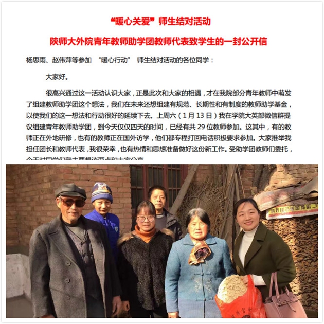 为了进一步发挥学院教师党员对学生的思想引导和生活帮扶,学院先后出台《永利集团3044am官方入口党政领导联系党支部制度》《永利集团3044am官方入口党政领导联系少数民族学生制度》《永利集团3044am官方入口教师党员联系家庭经济特别困难学生制度》,并制作结对帮扶卡,对于学生在思想、学习、生活、就业等多方面开展指导,进行党员教师对家庭经济困难和特殊学生一对一引导帮扶,受到学生的认可。2018年1月,永利官网“教师结对帮扶家庭经济困难学生”专项行动正式启动,本科生、研究生共计300余名家庭经济困难学生与学院教工结成帮扶对子。在雷震等老师的带动下,永利官网教师还自发组建了“陕师大外院教师助学团”。截止目前,大学英语教学部、英语系等部门共79位老师捐资7850元用于困难学生帮扶。