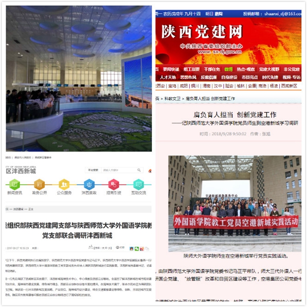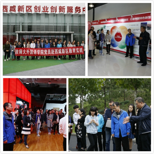 为了进一步帮助师生党员了解社会和国家发展趋势,增强了立足本职服务社会的意识,学院先后组织师生党员赴西咸新区的沣西新城和空港新城开展实践教育和调研。2017年9月27日,永利集团3044am官方入口教工党支部联合陕西党建网支部成员共40余人赴西咸新区沣西新城开展党员教育实践活动,先后调研了西咸新区双创展厅、西咸新区海绵城市研究试验中心、中心绿廊及西部云谷等地,全面地了解沣西新城在城市规划建设、双创文化、海绵城市建设发展、绿色城市理念、西部云谷创新创业等方面的情况。2018年9月26日,由学院党委书记马正平、副院长鲁燕带队,师大三代外语人一行50余人赴空港新城学习调研国企党建、“放管服”改革和自贸区建设等工作,参观了空港新城政务服务中心、空港国际快件监管中心和西咸保税物流中心,并听取了空港集团公司党委书记、董事长蒙彬对国企党建的介绍。“党员课题攻关”活动——确定一个课题,破解一道难题,促进一项工作,党员警示镜,支部党员季度考核栏等党建创新做法让师生们深受启发。