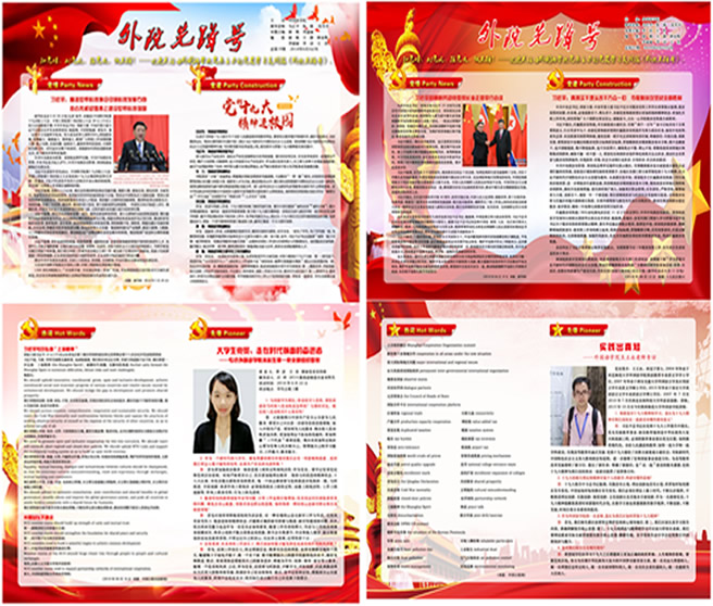 为了进一步加强师生党员的思想建设,学院党委每月定期开展党员主题宣传,同时每两周向各支部编发《外院先锋号》党员学习周报。周报分为“党情(Party News)”“党建(Party Construction)”“热词(Hot Words)”“先锋(Pioneer)”四个板块,从不同角度开展思想引领和政策宣传,加强党务知识培训。自2017年春季开始,目前已编印22期,针对党建热点和党务规范开展宣传,并先后采写学院优秀师生党员先进事迹10余人,起到了较好的榜样引领作用。
