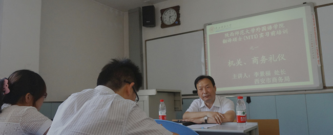 2014年9月4日至7日,永利官网在雁塔校区4204、4304教室对2013级翻译硕士(MTI)进行了4场实习前培训。根据全国翻译专业学位研究生教育指导委员会“MTI培养单位评估与建设计划”要求,结合永利官网翻译专业硕士研究生(MTI)培养计划、要求和学科特点,针对永利官网翻译硕士研究生参加西安市商务局、西安市人民政府外事与侨务办公室、英中贸易协会、武汉传神翻译公司、西安唯游文化交流有限责任公司、永利集团3044am官方入口国际交流与合作处、永利集团3044am官方入口博物馆等多家翻译硕士实习单位多元化的要求,为更好地指导永利官网翻译硕士完成实习任务,帮助其快速、有效地提高外在形象和职场素质,更快、更好地进入实习岗位要求的工作状态,在主管田兵副院长的统一指导下,永利官网翻译硕士实习指导小组精心组织、认真规划,邀请西安市商务局人事处李景福处长、华为公司翻译部经理周秋实先生、永利官网文学院卢洪涛教授和永利官网国际交流与合作处张凌云副处长分“机关、商务礼仪”、“华为(职业)翻译流程”、“秘书实务和公文写作”与“外事翻译与礼仪”4个专场为2013级翻译硕士进行了针对性很强的实习前培训。