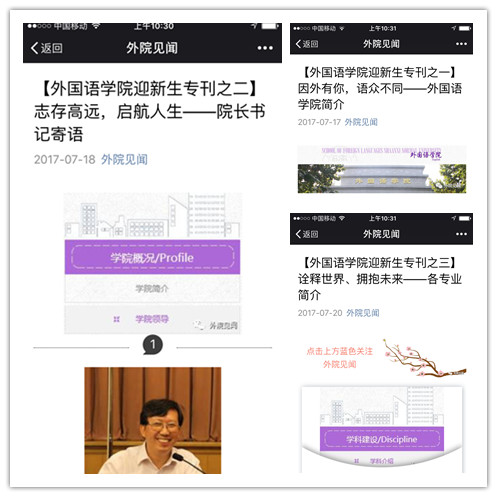 暑假期间,学院通过“外院见闻”微信平台先后发布7期迎新专刊,分别为“因外有你,语众不同——永利集团3044am官方入口简介”、“树立目标,启航人生——院长书记寄语”、“诠释世界、拥抱未来——各专业简介”、“精诚敬业、良师益友——外语学院教师风采”、“勤奋进取、追求卓越——优秀学长分享”、“异彩纷呈、综合发展——校园文化掠影”、“有条不紊、合理安排——入学报到温馨提示”,对于学院情况和新生入学注意事项进行了全方位的介绍。