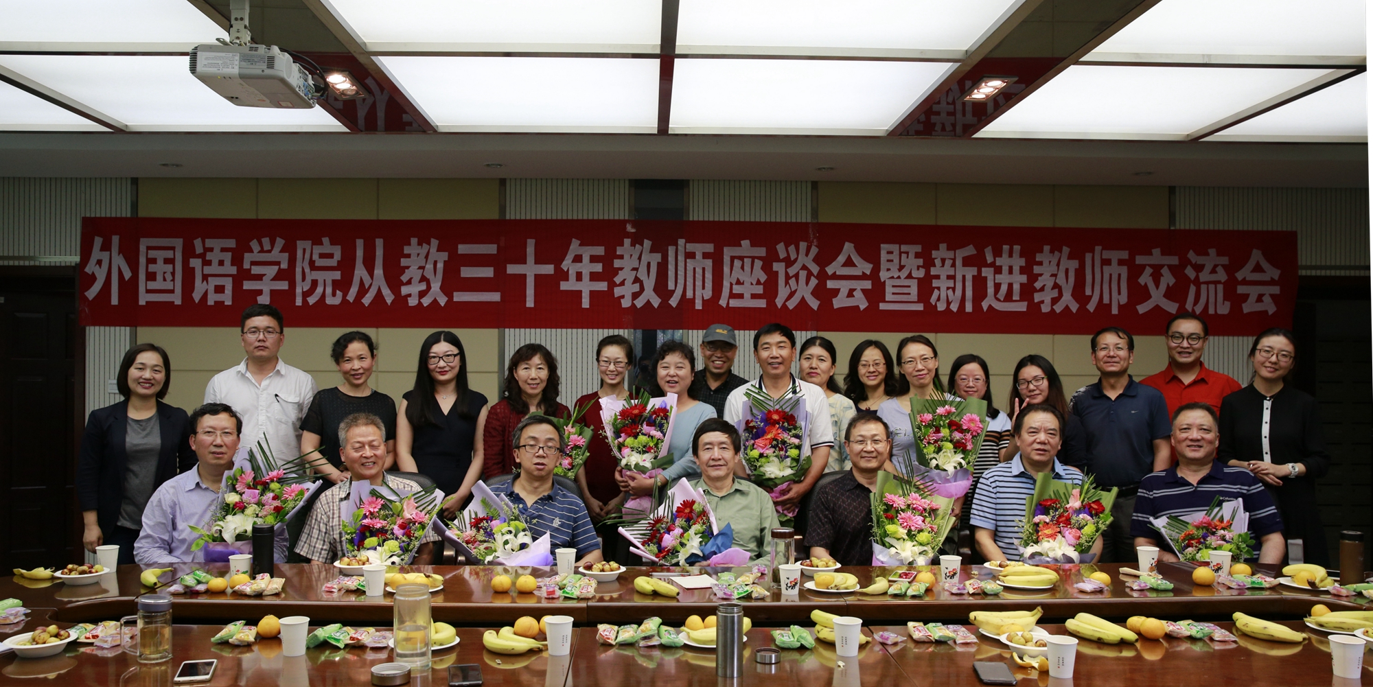 随后,与会新进教师向老教师献花,大家一起合影留念。