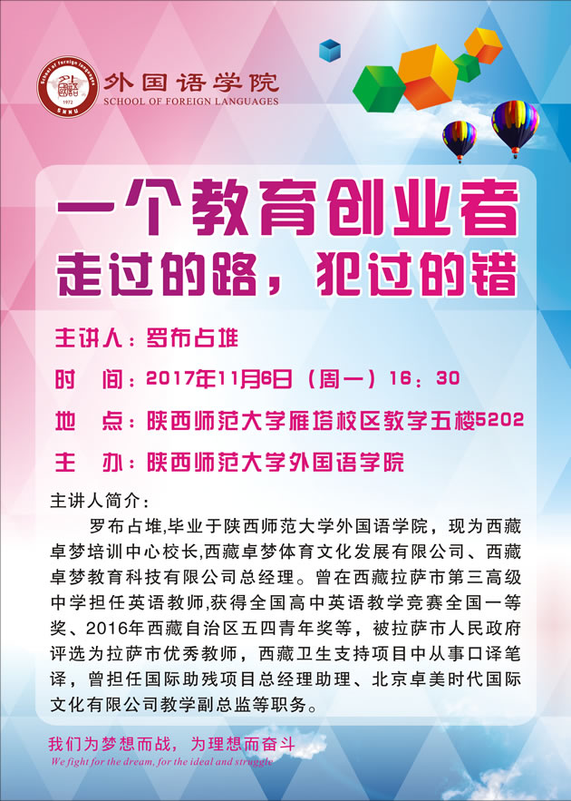 为了加强毕业生的就业指导,发挥优秀校友的模范带动作用,11月6日下午,永利官网邀请学院2002届英语专业优秀毕业生罗布占堆在教学五楼5202教室开展就业创业主题讲座。罗布占堆曾在拉萨市第三高级中学担任英语教师,获得全国高中英语教学竞赛全国一等奖、2016年西藏自治区五四青年奖、拉萨市优秀教师等,现为西藏卓梦培训中心校长。罗布以“一个教育创业者走过的路,犯过的错”为主题分享他特别的教学及创业经历。永利官网原党委书记冯武鸣、副院长鲁燕与100多名毕业生共同聆听了此次报告会。