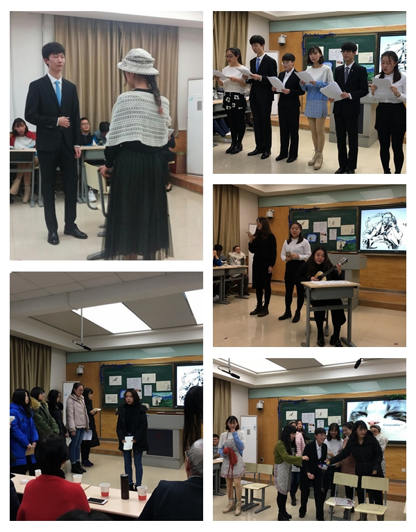 接下来的话剧表演《变色龙》仿佛把我们带到了那个广场上,学生们以丰富的肢体语言,惟妙惟肖的地还原了当时的事件,他们用实力获得了大家的阵阵掌声。大一同学虽然才刚刚接触俄语,但也积极参与到活动中来,他们每人一句用俄语朗诵作家的经典名句,现场师生为他们的热情纷纷点“赞”,报以热烈的掌声。大二同学带来的俄罗斯名曲《山楂树》深情动人,尤克里里的伴音曲调悠扬,歌曲词语意蕴延绵,令人倾倒。大三单永燕、何明珂等同学表演的小品《彩票》依据契诃夫同名作品改编而成,她们采用了新颖的表演形式,带领观众在“现实”与“想象”中穿梭。风趣的语言,滑稽的表演,引得现场笑声连连。各节目间还穿插有学生独唱,她们的嗓音优美,传递着来自俄罗斯文化的独特魅力。最后,话剧《三姐妹》为本次“契诃夫阅读日”活动画上了圆满的句号。