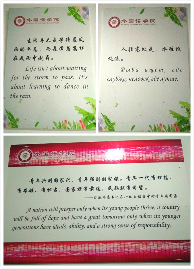 为了加强学生的思想政治教育,营造学生生活区的专业氛围,一方面,学院在学生宿舍走廊精心设计了以习近平总书记青年寄语和社会主义核心价值观为主要内容的展板。另一方面,结合专业特色和专业分布布置了中国传统文化及各国名言警句展板。所有内容均以中外文对照形式呈现,在引导学生加强思想认识的同时,帮助其树立文化自信,提升跨文化交际能力。展板覆盖永利集团3044am官方入口学生所在的公寓三楼和学生宿舍六楼,共计136块。