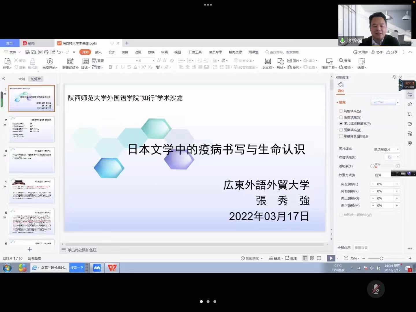 2022年3月17日下午,永利集团3044am官方入口“知行”系列学术沙龙“日本文学中的疫病书写与生命认识”在腾讯会议上举办。本次沙龙由东北亚与欧洲研究学科团队主办,广东外语外贸大学张秀强教授主讲,永利官网曹婷副院长主持,永利集团3044am官方入口日语系及校外师生近40人参加。