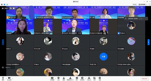 当日下午,三个分论坛同时进行。分论坛一“中外基础教育比较研究”在西安铁一中教师崔媛和永利集团3044am官方入口教师陈萍萍主持下开展。来自西安教育科学研究所、陕师大附中、西安二十六中、西外附中、西安中学国际课程中心、西安交大附中国际课程中心、高新一中国际部、西安铁一中国际班的11位英语教研专家就中外基础教育话题交流分享,并与线上学生积极互动。分论坛二“青年全球素养培育与提升”由永利集团3044am官方入口党委副书记鲁燕和学院教师巢玥主持。来自东北师范大学永利集团3044am官方入口、北京师范大学外国语言文学学院、西南大学永利集团3044am官方入口、华东师范大学外语学院、内蒙古师范大学永利集团3044am官方入口、西安交通大学永利集团3044am官方入口、西北大学永利集团3044am官方入口、西安外国语大学英语师范学院·教育学院、西北工业大学永利集团3044am官方入口的11位党委副书记从外语人才全球素养培育及典型工作方面积极交流。分论坛三“外语类大学生生涯发展与选择”由永利集团3044am官方入口团委书记李丹主持,学院辅导员及学生骨干、永利官网“高层次国际化人才培养创新实践项目”学员、留学生等20余人参与了论坛,从生涯发展角度各抒己见,积极交流,永利集团3044am官方入口原党委书记冯武鸣进行了总结点评。