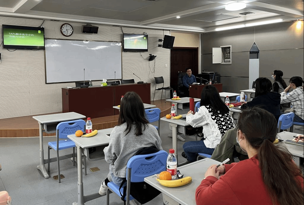 郑老师首先从选题背景、理论依据、实验过程的具体设计以及数据收集、整理和分析各个环节和角度介绍了TAPs 翻译教学研究的思路和设计,并以此为例,结合自身科研经验给学生介绍此类实证研究的方法。随后,郑教授和大家围绕TAPs翻译教学相关的几个问题进行了讨论。