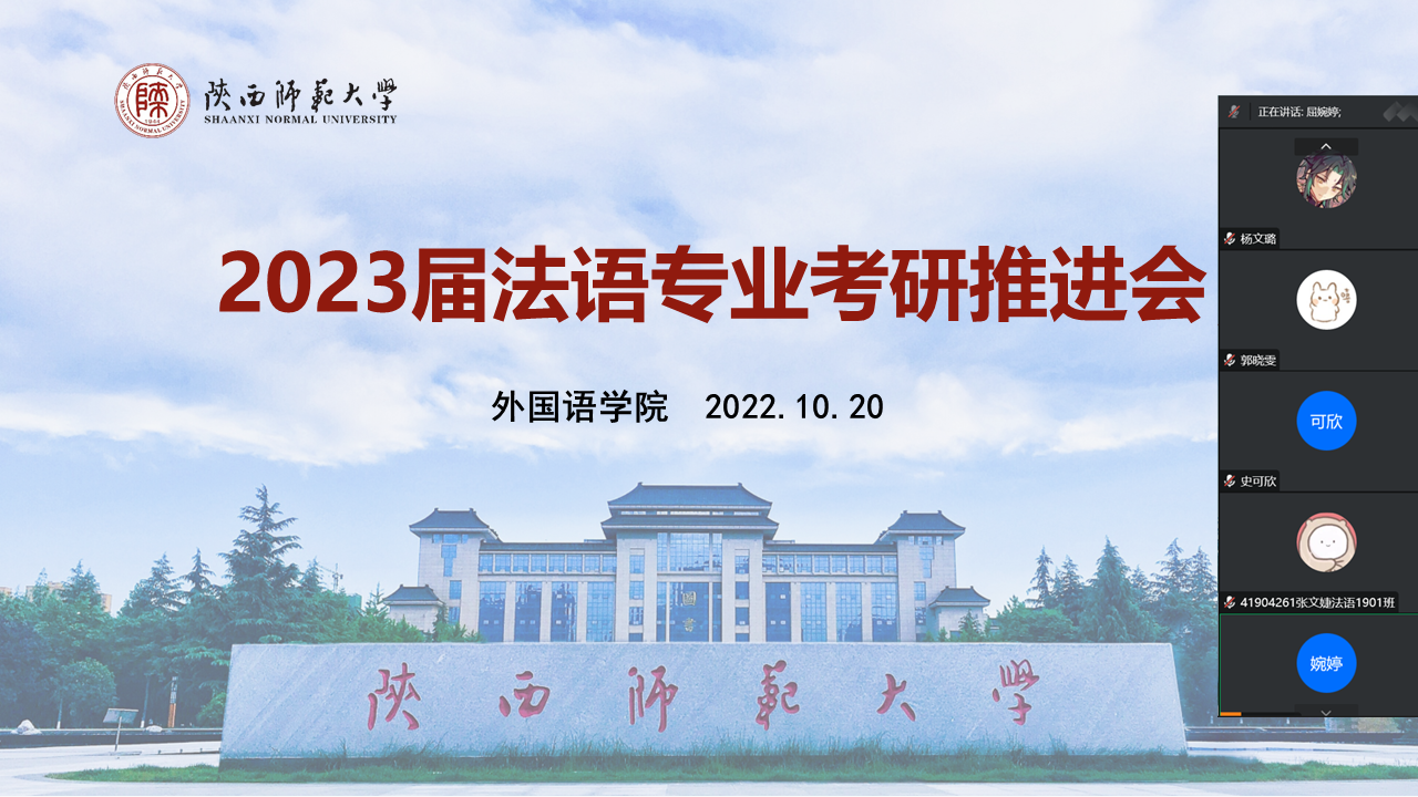 为了解同学们的考研备考情况,增强学生考研信心和动力,永利官网于10月20日晚在学生公寓三楼105和线上腾讯会议同步召开2023届法语专业考研推进会。学院副院长孙坚、学院副书记鲁燕、法语系主任王燕红和法语系教师乔溪共同参加。会议由辅导员屈婉婷老师主持。