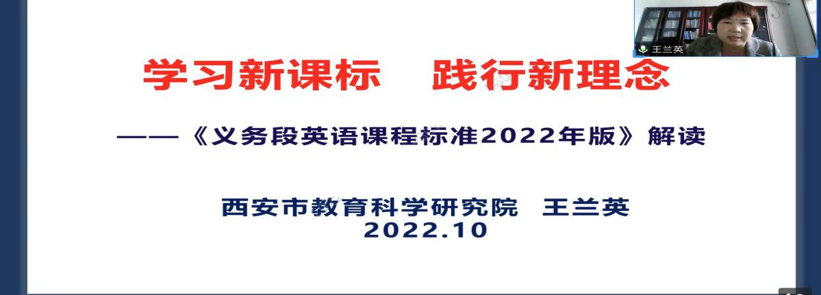 课程标准是指导教师教学最重要的工作指南。为了提高教育硕士的外语教学能力,永利集团3044am官方入口于10月14日下午在腾讯会议线上进行了基础教育外语教学专题研究系列讲座第八讲——《义务教育英语课程(2022版)》标准解读。本次讲座由西安市教育科学研究院中学英语教研员王兰英老师主讲,韦理老师主持。永利集团3044am官方入口2022级学科教学(英语)专业教育硕士参与聆听。