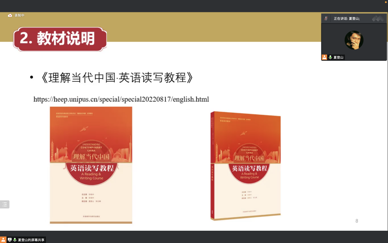 首先,夏教授基于习近平总书记于2016年9月在政治局集体学习时的讲话,强调了外语教育改革的时代背景,参与全球治理需要一大批熟悉党和国家方针政策,了解我国国情、具有全球视野、熟练运用外语、通晓国际规则、精通国际谈判的专业人才。提出专业教育如何服务国家战略,帮助中国更好走向世界,让世界更好了解中国,创新知识体系、课程体系和教材体系,培养堪当民族复兴大任的外语人才的问题。其次,夏教授展开了对《理解当代中国英语读写教程》的说明。《英语读写教程》 旨在将习近平新时代中国特色社会主义思想的学习与英语读写能力的培养有机融合,引导学生系统学习、 深入领会习近平新时代中国特色社会主义思想的核心要义,学会用中国理论观察和分析当代中国的发展与成就,从跨文化视角阐释中国道路和中国智慧,坚定“四个自信”。再次,夏教授详细介绍了该教材在课程实施中的具体安排。随后,夏教授从素质目标、知识目标及能力目标三个维度进行了相关阐述,启发高校教师要培养学生的全球视角,讲好中国故事。最后,夏教授指出高校教师应注重学生价值塑造、知识传授和能力培养,建设课程学习形成性评价体系。夏教授特别强调,理解当代中国需要课程思政、多元能力以及融合学习三方面的有机整合。
