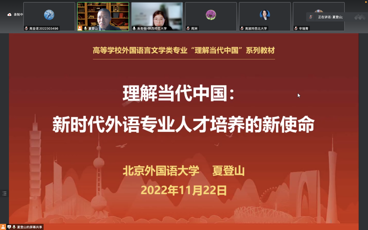 2022年11月22日下午,永利官网于线上成功举办了以“理解当代中国:新时代外语专业人才培养的新使命”为主题的一流本科专业建设论坛,本次论坛由北京外国语大学夏登山教授主讲,永利官网朱冬怡副教授主持,100余名校内外师生参与了交流讨论。